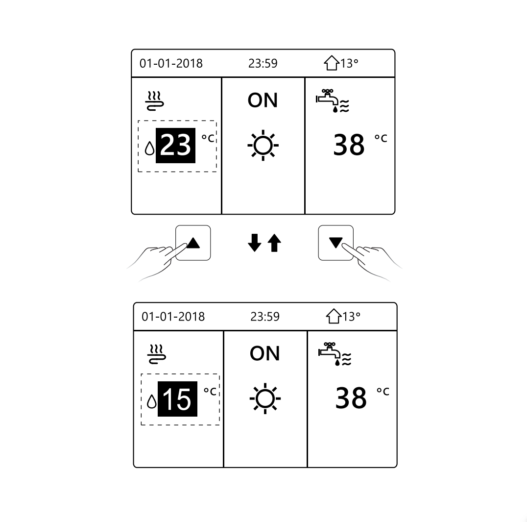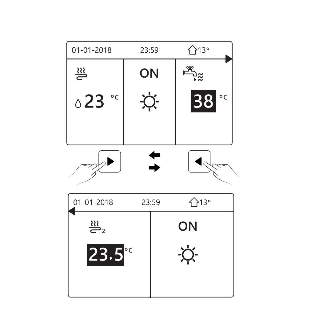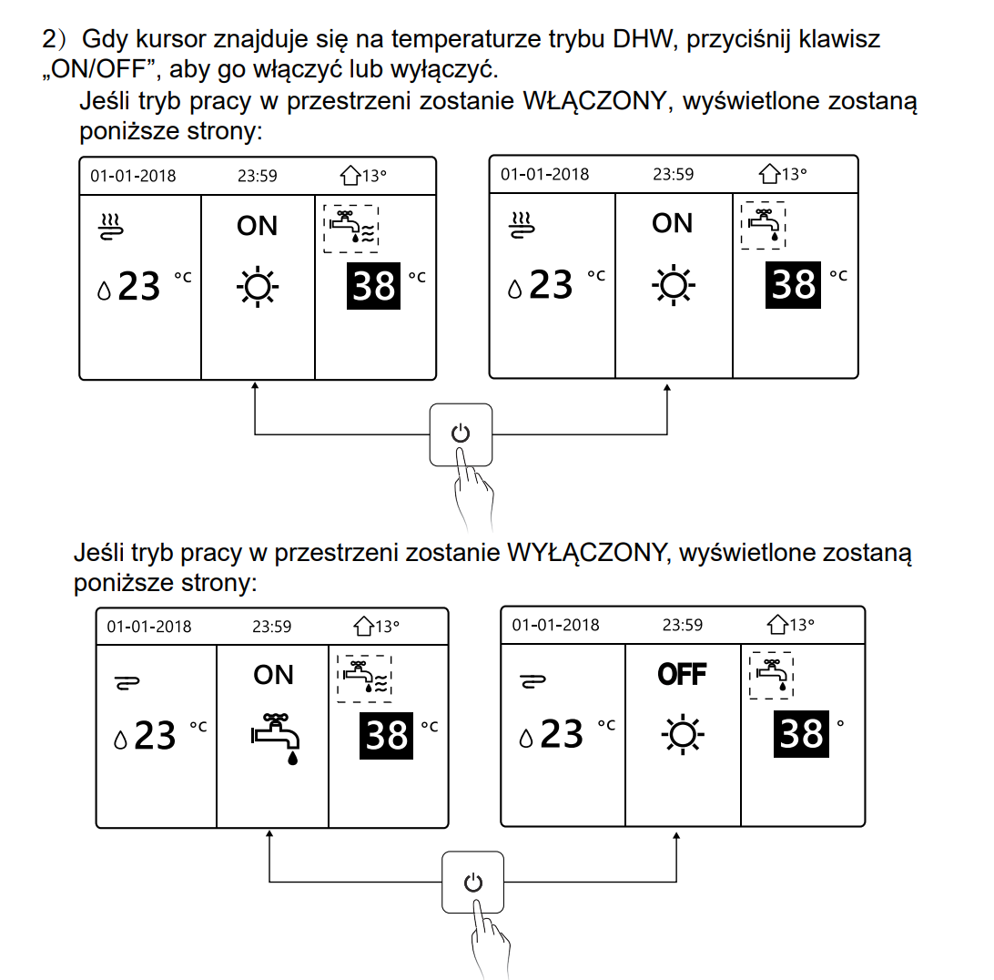 - ON/OFF – włączanie i wyłączanie ogrzewania, chłodzenia lub DHW.