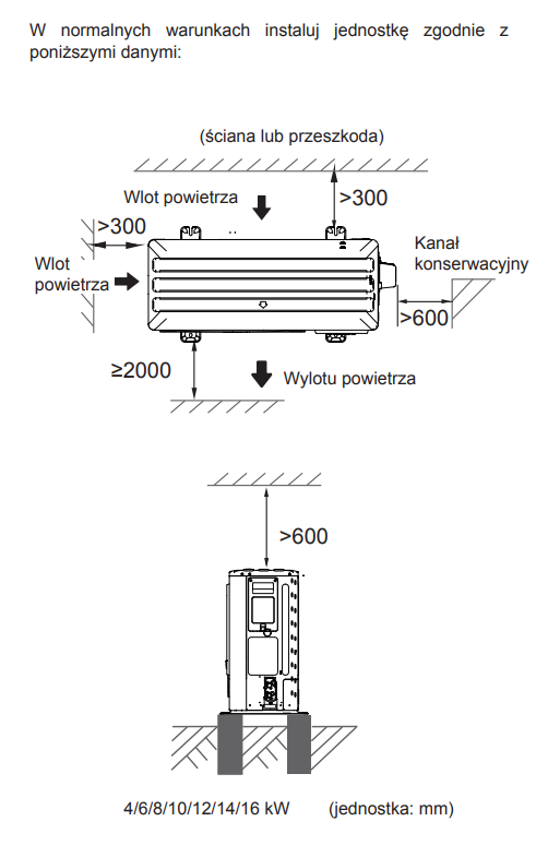 Nieprzestrzeganie tych odległości może skutkować oblodzeniem jednostki i spadkiem wydajności.