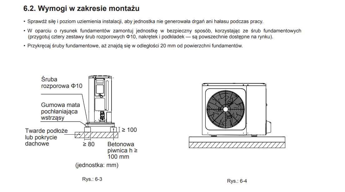 Jednostkę należy przykręcić śrubami fundamentowymi, zachowując stabilność i odporność na wiatr.