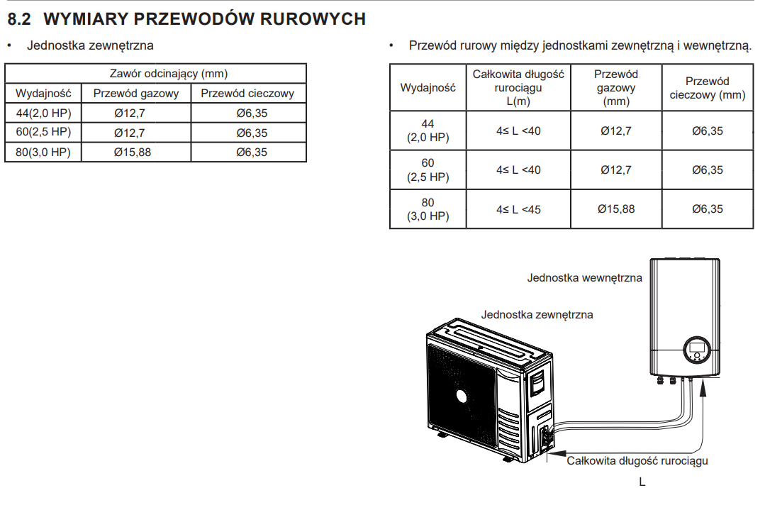 Rury czynnika chłodniczego łączą jednostkę zewnętrzną z jednostką wewnętrzną (modułem hydraulicznym). W modelach Hi-Therma stosuje się miedziane rury chłodnicze o określonych średnicach i maksymalnych długościach – producent podaje w instrukcji zalecane średnice dla gazu i cieczy oraz dopuszczalną długość całkowitą rurociągu.