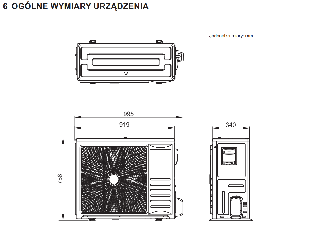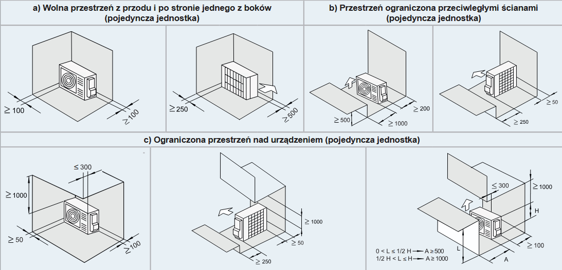 Producent zaleca pozostawienie wokół jednostki zewnętrznej wolnej przestrzeni serwisowej i wentylacyjnej. Praktyczna zasada dla domu jednorodzinnego: