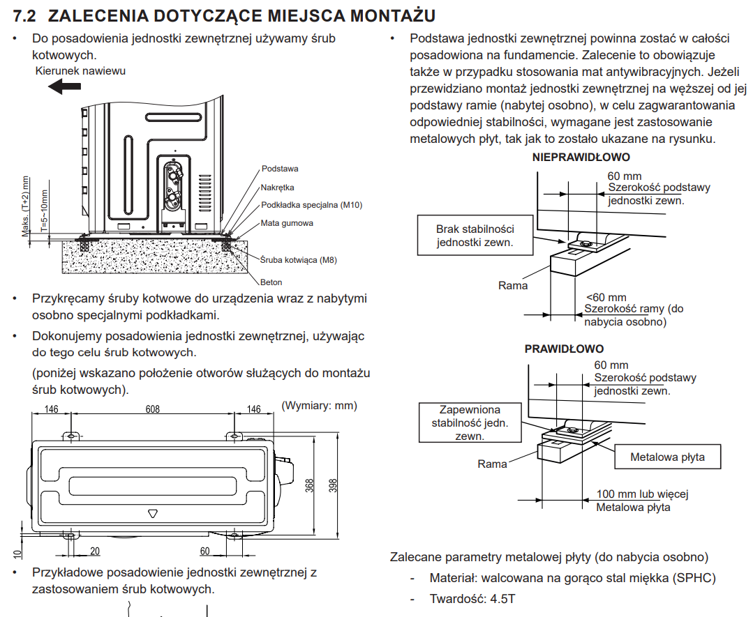 Solidny fundament to brak drgań, mniejszy hałas i dłuższa żywotność urządzenia. Jednostka nie może „bujać się” na wąskiej ramie ani stać na krzywym podłożu.